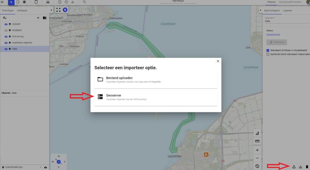 Klik rechtsonder op het icoon “Objecten importeren” en selecteer “Geoserver”.